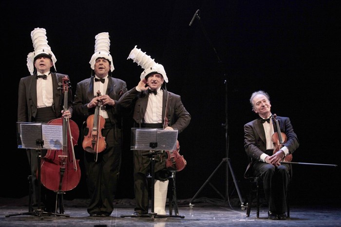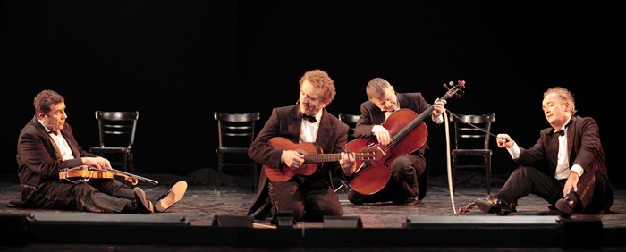 Danseurs de Cordes, bien nommé, fait aussi la part belle à la danse et au chant. C'est un spectacle total. Jean-Claude Camors, Pierre Ganem, Jean-Yves Lacombe et Laurent Vercambre bougent et dansent comme jamais et on est heureux de (re)trouver leurs voix magnifiques, superbement placées, aux tessitures étonnantes. Quant à l'humour, toujours percutant, il est embusqué au détour de chaque image et savamment distillé par la mise en scène poétique d'Alain Sachs.