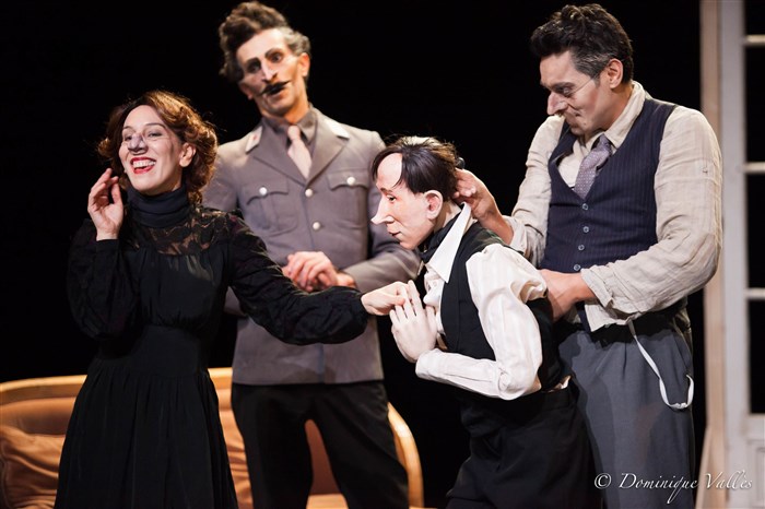 Cette mise en scène est intéressante, pleine d'idées. Le choix du mannequin pour Khlestakov est se défend certainement, mais à ce compte là ils peuvent tous être transformés en marionnettes ! Ossip et son maître deviennent des manipulateurs, en bons profiteurs qu'ils sont, même si, au départ, ils ne l'ont pas cherché. Il y a donc les masques, artifice guère utile, le texte et le jeu doivent se suffire à eux-même. On suit avec plaisir les tribulations de ce petit monde, mais l'ensemble est assez mou, sauf peut-être vers la fin, où le bourgmestre, notamment, s'emballe avec un certain bonheur. La musique, discrète, est toujours là, qui souligne les réparties avec délicatesse et à propos.