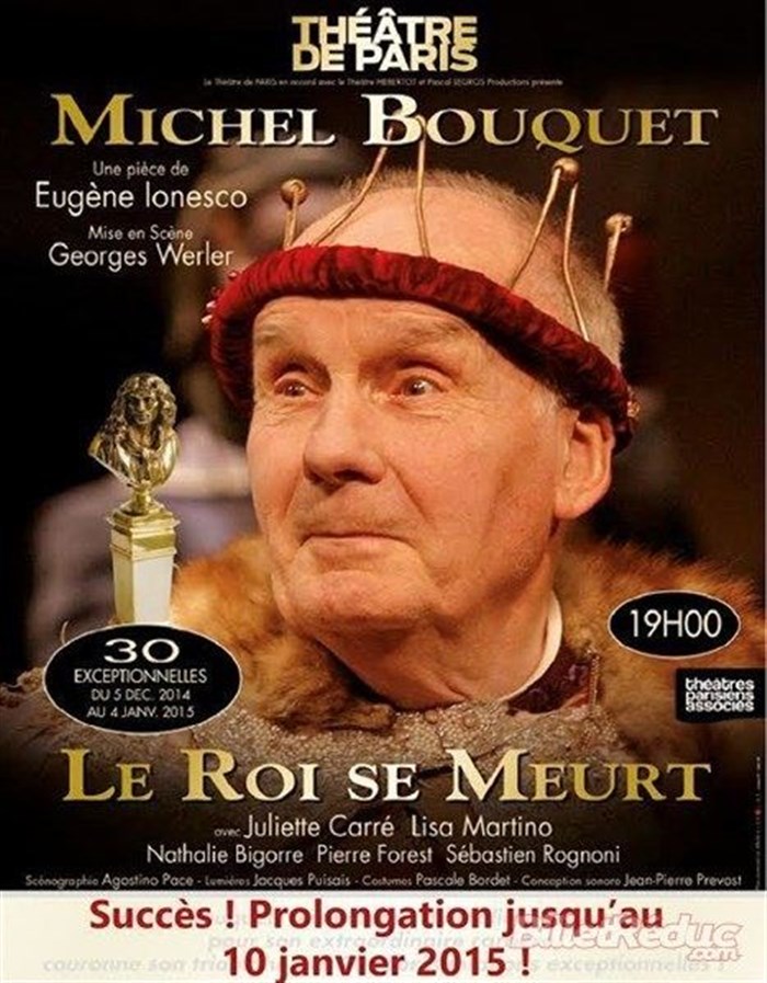 Michel Bouquet entre, traverse la scène et tout est dit. Respect ! Dialogues parfois si décalés que le rire jaillit mais surtout poignants, ce vieillard devant la mort et ce dialogue de fin avec la vieille reine. Inoubliable.