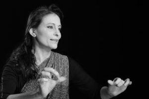 Annie a étudié le théâtre-dansé Kathakali en Inde. Experte dans cette technique et sa riche gestuelle – telle une Langue des Signes dramatisée - elle réalise de nombreux spectacles de contes illustrés de ce langage et de sa pantomime pour en restituer visuellement la poésie.
