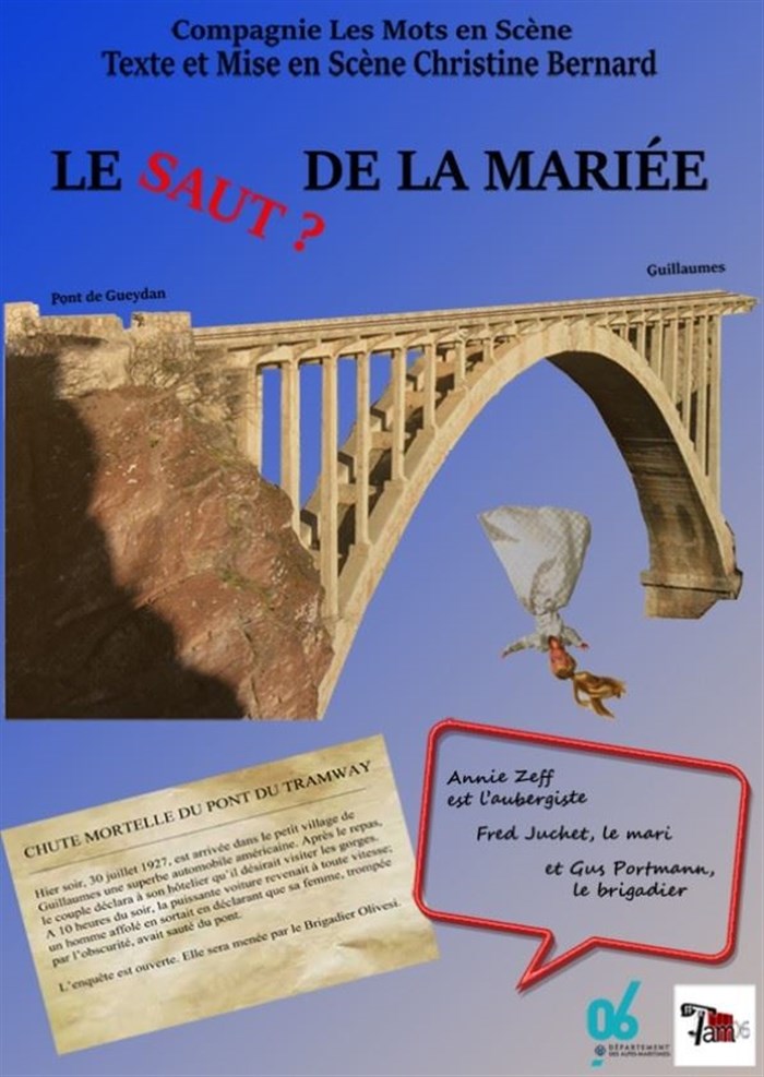 "Le Saut de la Mariée" est une comédie policière écrite par Christine Bernard, une pièce intimement liée au patrimoine de notre région. Elle explicite en effet le nom de l'un des ouvrages d'art de notre région : Le Pont de La Mariée, à Guillaumes, dans les Gorges du Daluis.