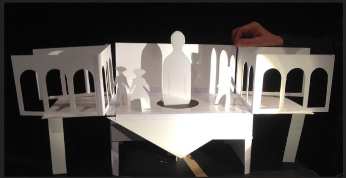 Pour accompagner sa démonstration, le metteur en scène et marionnettiste s'appuie sur une maquette évolutive du lieu théâtral de l'antiquité à nos jours.