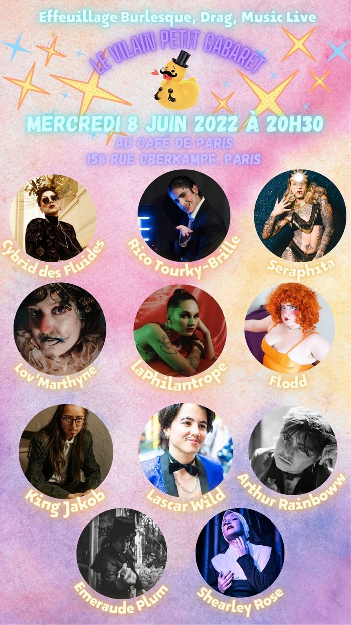 Le Vilain Petit Cabaret est un petit univers hors du temps dans lequel se mélangent différentes influences des multiples courants de la pratique du cabaret de manière aussi inclusive que possible et bienveillante.