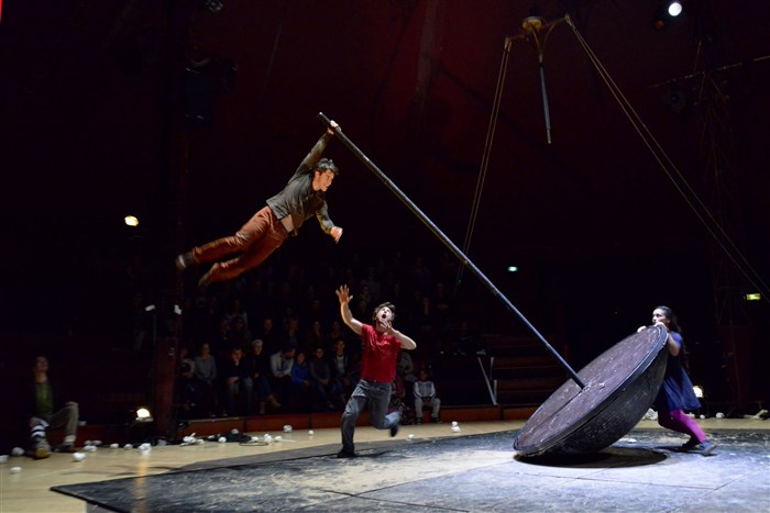 Autour d'un mât culbuto, quatre acrobates bouillonnant de parole et de musique.