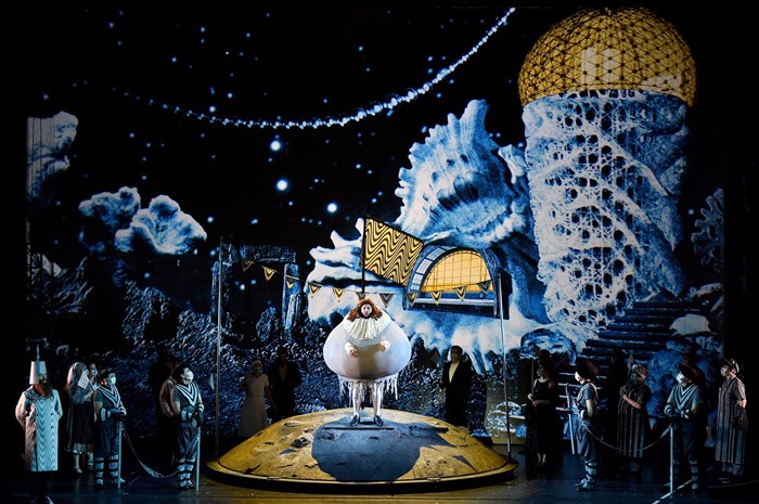 Tout un monde onirique se retrouve dans une mise en scène qui n'a négligé aucun détail : l'Observatoire de Paris, un haut-fourneau, des paysages lunaires, un volcan, un palais de verre, des galeries de nacre... autant de lieux où l'action enlevée est servie par une troupe de comédiens-chanteurs de premier ordre.