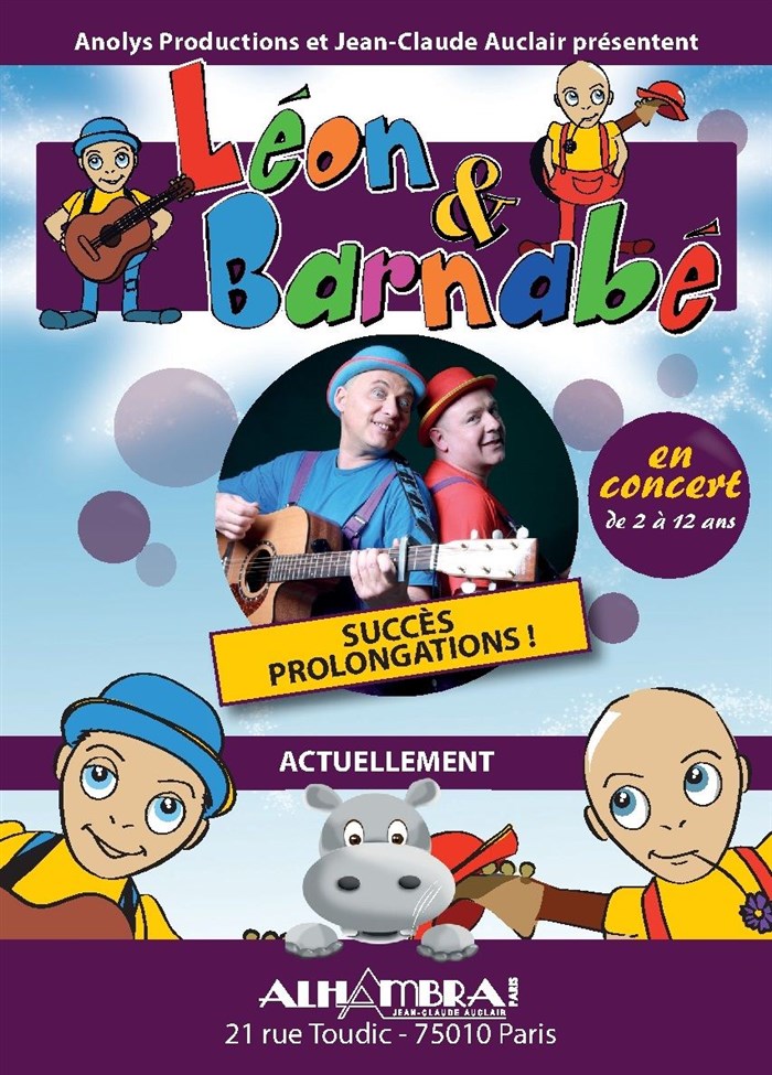 ...Léon & Barnabé aiment par dessus tout divertir le jeune public en chansons... Accompagnés sur scène par deux talentueux multi-instrumentistes, Léon & Barnabé offrent un véritable concert pour les enfants où les mélodies entêtantes se marient parfaitement aux paroles rigolotes.