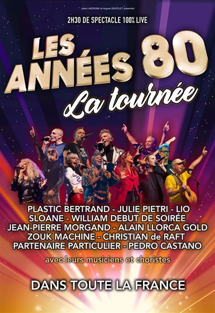 Jean-Luc Lahaye, Plastic Bertrand, Lio, Julie Pietri, Zouk Machine, Pedro Castano, Jean-Pierre Morgand, Sloane, Partenaire Particulier, Christian de Raft sont réunis sur scène pour vous faire revivre en live leurs plus grands tubes des années 80 que vous connaissez tous.