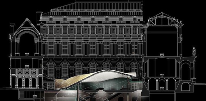 Point d'orgue du projet architectural, la cour Visconti est recouverte d'un ouvrage extraordinaire, un voile doré de verre et de métal, qui respecte les façades historiques tout en l'ornant d'un élément d'une grande originalité.