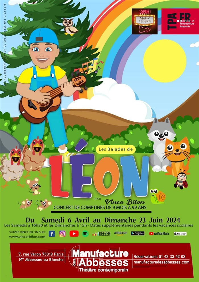 LÉON, nous invite à ce concert de comptines dynamique et rythmé, 100% live "Guitare-Voix", avec une sélection de chansons variées, ainsi qu'un décor très coloré, le tout adapté à chaque saison.