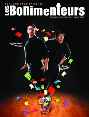 Ça commence dès l'entrée de la salle où le public inscrit des thèmes qui seront tirés au sort au cours de la soirée. Sans concertation et en véritables professionnels de l'improvisation, Marco et Ducci les jouent et les intègrent à leur histoire tout au long du spectacle. Excellents comédiens, narrateurs, illustrateurs, chanteurs, Les Bonimenteurs jonglent alors avec les situations et les personnages, traversent les époques et nous emmènent sur des chemins impro-bables.