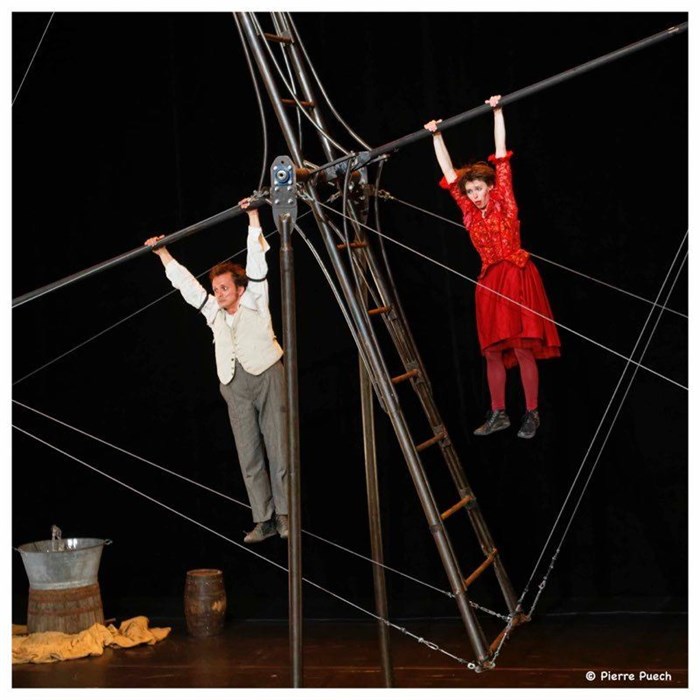 Avec leurs cervelles de piafs, les Butors se déplacent sur une invention délicieusement spectaculaire : à 7 mètres de hauteur, 350 kg de ferraille, d'astuce, de précision et de grâce avec une immense échelle rotatoire et des roues de la mort...
