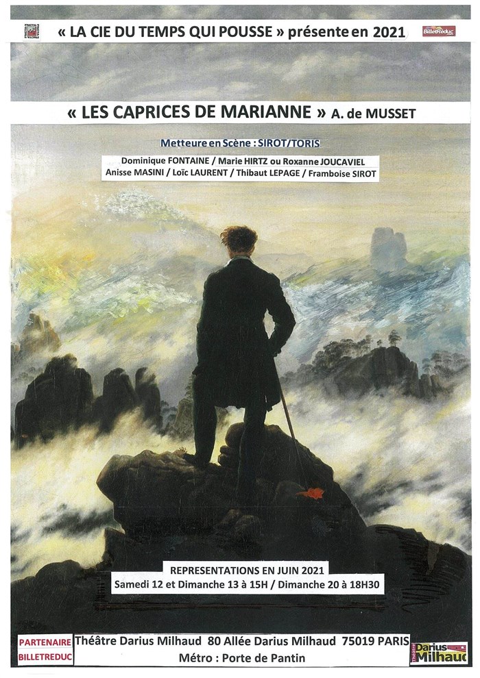 " La Cie du Temps qui Pousse " nous propose un grand classique d'Alfred de Musset " Les Caprices de Marianne " dont le thème est toujours d'actualité : la complexité du désir féminin et du sentiment amoureux, entre conditionnements culturels et élans émotionnels. Framboise Sirot, metteure en scène, comédienne, nous concocte une version intemporelle, enlevée, émouvante et ludique de cette pièce. Elle joue deux personnages antinomiques, Ciuta, l'entremetteuse et Hermia, la mère de Coelio à merveille. A noter le talent d'Anisse Masini qui interprète un Octave convainquant avec fougue et persuasion. Les autres comédiens sont également à la hauteur de leur personnage comme Roxanne Joucaviel ( Marianne) ou Thibaut Lepage (Tibia et Malvolio) etc ...Un spectacle joyeux et réjouissant à venir apprécier en famille....