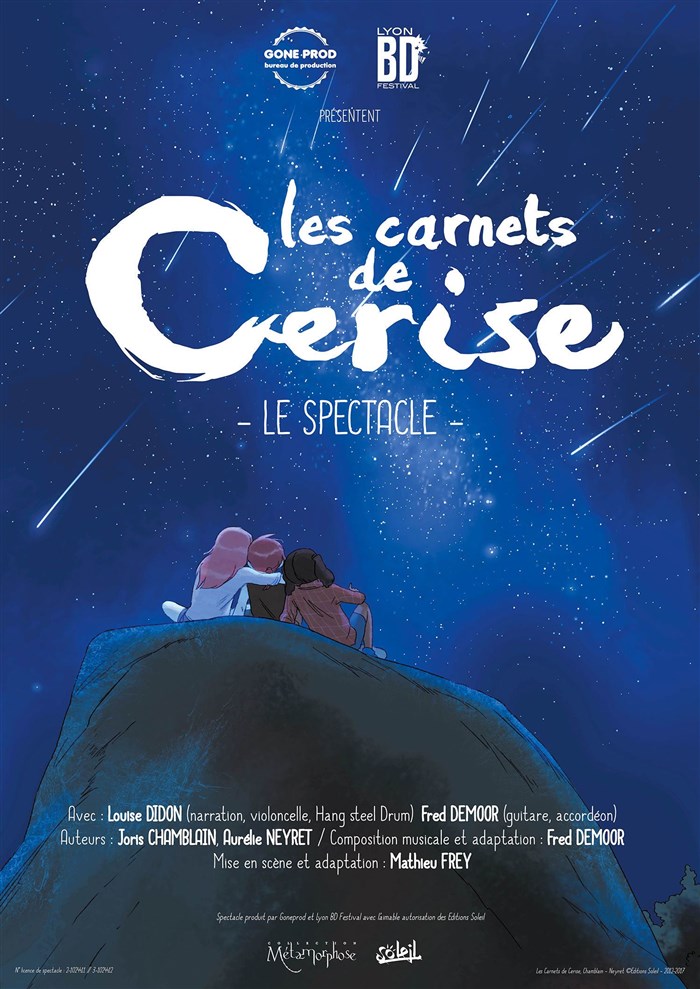 Les Carnets de Cerise mêle théâtre, musique et vidéo dans un opéra-BD pour deux interprètes. L'adaptation de la BD à la scène se veut fidèle à l'oeuvre originale : universelle, exigeante, belle et sans moralisme, pour satisfaire à la fois les fans de la petite fille au chapeau d'Indiana Jones et conquérir celles et ceux qui la découvrent.