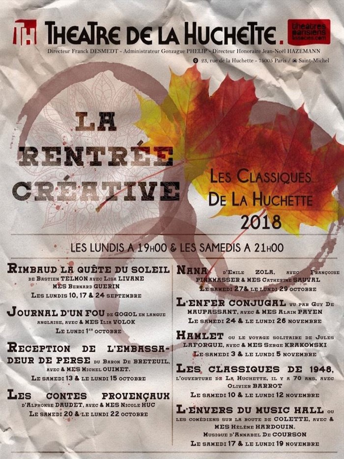 Gogol, Zola, Rimbaud, Maupassant ou Daudet seront à l'honneur chaque semaine durant ces rendez-vous originaux des samedis et lundis. Un invité pour les 70 ans du théâtre: Olivier Barrot qui évoquera l'effervescence artistique de 1948...