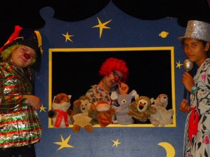 Un clown blanc et deux augustes présentent des histoires pour les petits sur le couché, le partage et l'entraide
