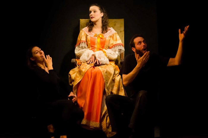 Sur scène, alors qu'Hermine répète sa lecture des contes pour le roi, ses deux acolytes, Marianne et Galopin interprètent l'ensemble des personnages des contes. Un seul objectif : créer une petite représentation pour divertir le roi !