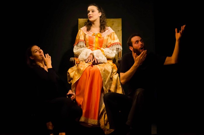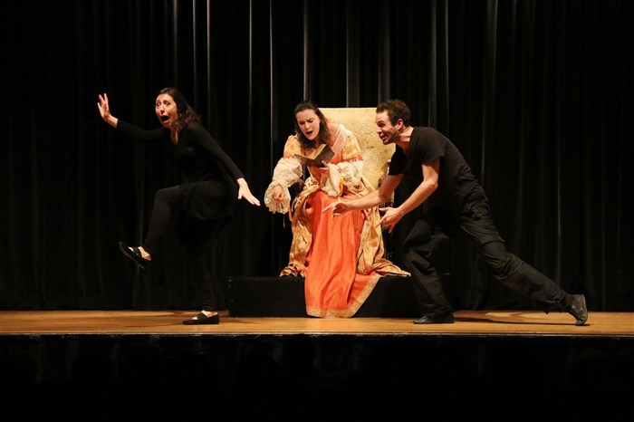 Hermine, la conteuse ouvre le livre. Ses deux compagnons, Marianne et Galopin, joueront tous les personnages : le chat, la princesse, la vilaine mère, Cendrillon, le Chaperon Rouge et sa grand-mère, le roi, le prince, le loup, la fée, le Marquis de Carabas... Ils sont tous là !