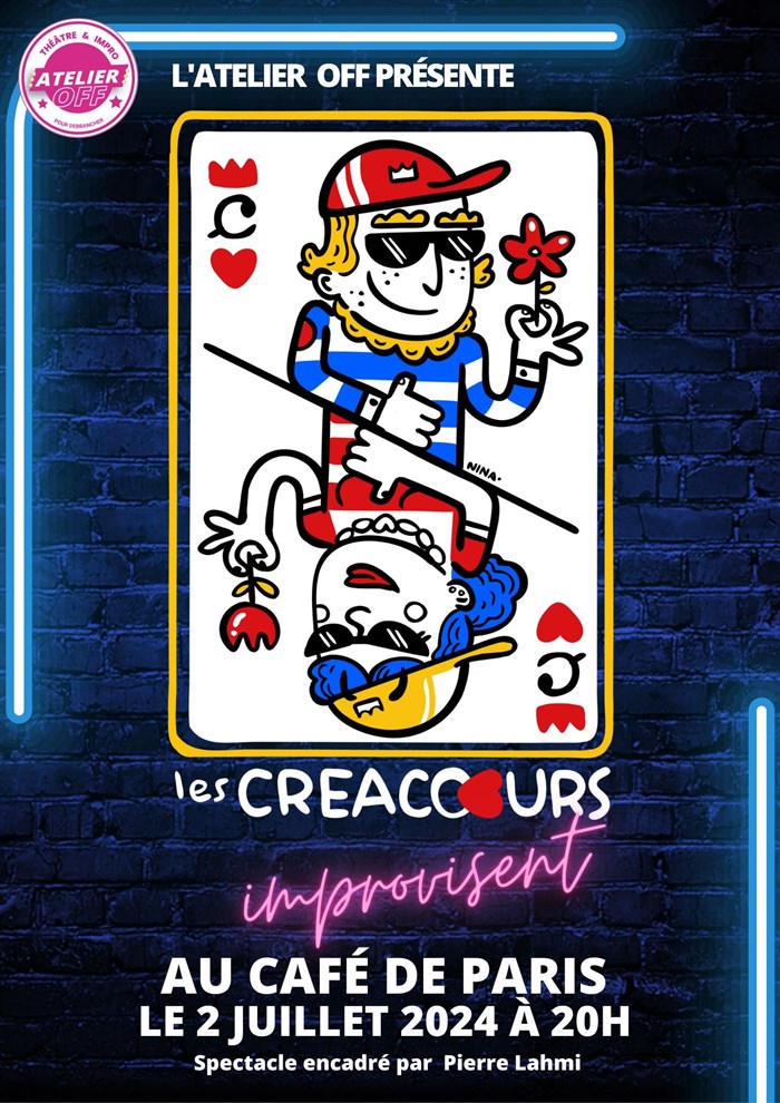 Les élèves de la troupe des Créacoeurs de l'Atelier Off improvisent au Café de Paris pour fêter la fin de cette saison 23-24 riche en émotions et improvisations. La mise en scène est signée par leur professeur : Pierre Lahmi.