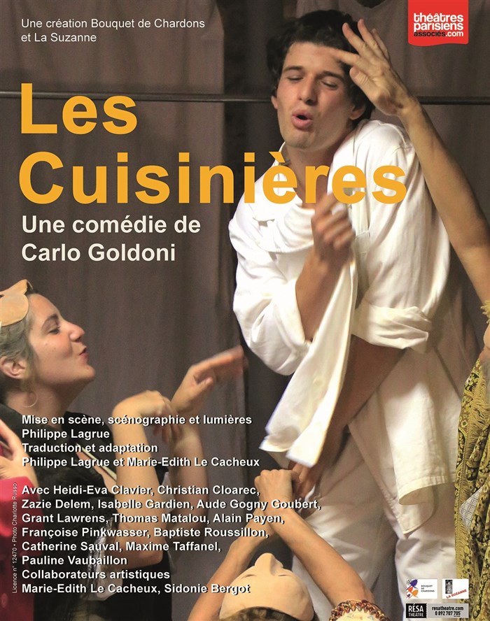Écrite en 1755, cette pièce Le Massere (les cuisinières) est construite à partir d'un canevas simple aux allures de farce et aux accents de Commedia dell'arte. Nous retrouvons ici la verve du Carlo Goldoni de " Arlequin, valet de deux maitres ", de " La Locanderia " ou des " Rustres ". Avec sa peinture acerbe et drôle des malices et des pirouettes vengeresses des femmes dans les maisons bourgeoises vénitiennes. Les situations centrées sur les personnages, leur grotesque et leur fourberie, font mouche. Philippe Lagrue, dans son adaptation et sa mise en scène, reprend cet esprit volontiers ironique et narquois en truffant la pièce de formules et de clins d'oeil contemporains à la manière des lazzi de l'époque. Des rideaux blancs posés sur des tringles, qu'on ouvre ou ferme entre les scènes, et deux bancs de bois pour tout décor, renforcent cette idée de restitution des jeux improvisés sur des tréteaux de foire. L'absence de musique dans les parties dansées des scènes de carnaval surprend comme le rythme un peu lent donné à l'ensemble. Le divertissement est pourtant là, même si une impression se dessine de simplicité poussée à l'extrême, touchant presque à l'austérité. A l'image de cette singulière scène finale du dénouement, qui intrigue et émerveille à la fois comme si la pièce arrivant à son terme, la morale reprend ses droits et l'ordre son règne. La distribution et notamment les quatre cuisinières jouées par Zazie Delem, Françoise Pinkwasser, Pauline Vaubaillon et Isabelle Gardien (ce soir-là), sont pétillantes à souhait et nous offrent un spectacle joyeux et agréable.