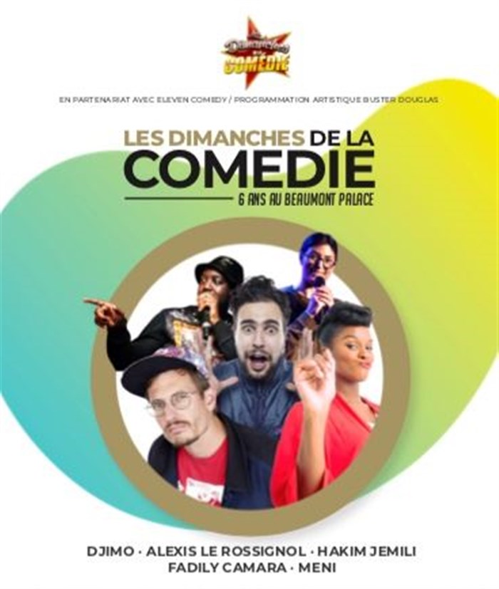 "Les dimanches de la comédie" fêtent leur 6 ans au Beaumont Palace. Pour cette occasion Djimo, Alexis le Rossignol, Hakim Jemili, Fadly Camara et Meni monteront sur la scène pour vous offrir un moment unique !