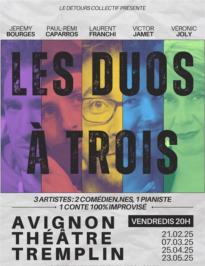 Ces 3 improvisateur.ice.s expérimenté.e.s ont une envie, créer un espace de rencontre au plateau pour partager leurs univers. Les Duos à trois sont leur joyeuse réponse à cette envie, et avec un pianiste la joie est plus colorée.