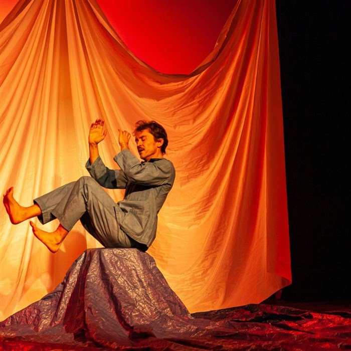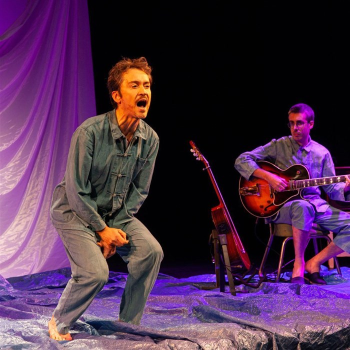 La poésie résulte parfois d'une économie de moyens, preuve en est avec ce spectacle adoubé par Anne Sylvestre à sa création. Sur une scène jonchée de bâches bleues au-dessus desquelles flotte un fin rideau blanc, Vladimir Médail et Olivier Hussenet s'emparent d'une sélection de morceaux de l'autrice-compositrice tous liés à l'eau. Au programme notamment : Une sorcière comme les autres, Porteuse d'eau, Maumariée...