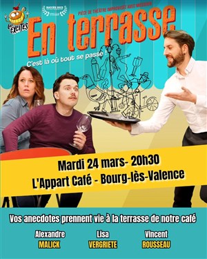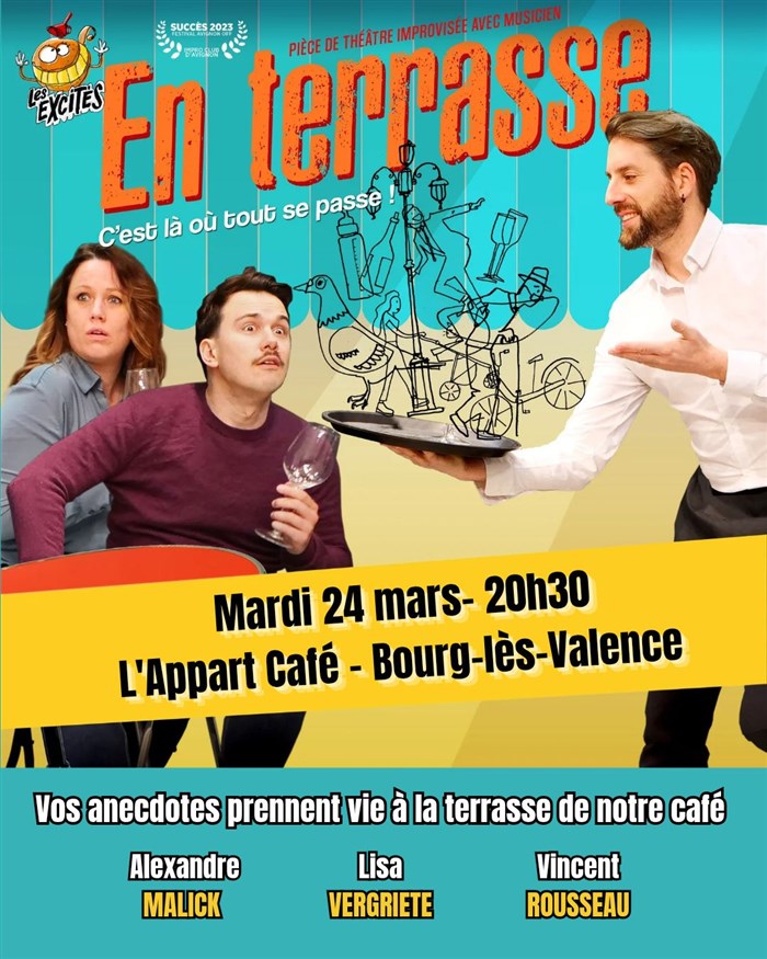 Découvre Les Excités dans En terrasse, qui fait partie de notre sélection d’événements de type Improvisation et qui se tient ici : L'Appart Café - Café Théâtre -