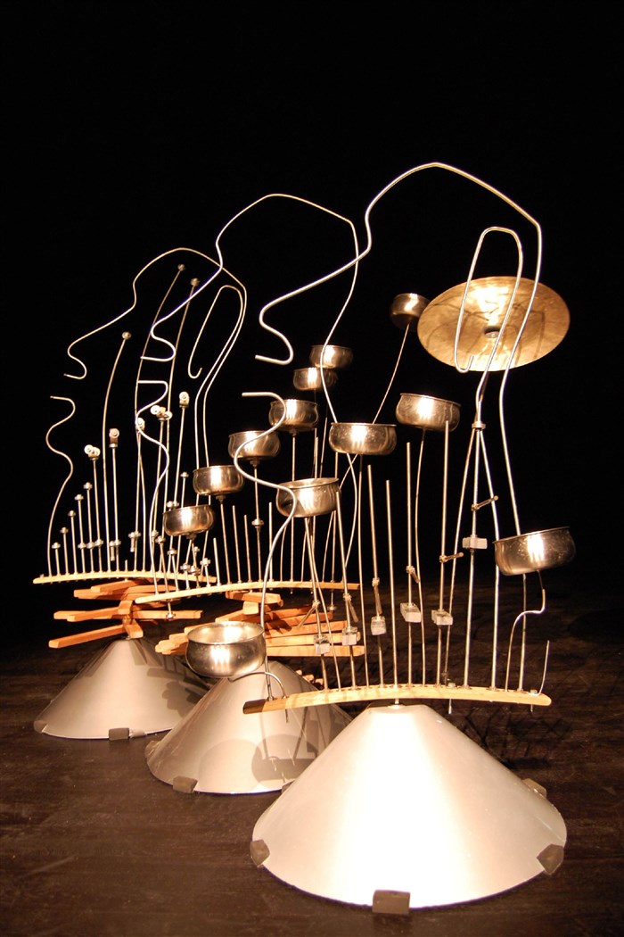 Sculptures d'ardoise et de bronze à tiges de verre frottées, structures de bois et de métal percutées par des baguettes, méta-instruments joués à distance par captation de mouvement..., les sculptures ont besoin de la main du visiteur pour devenir paysage sonore.