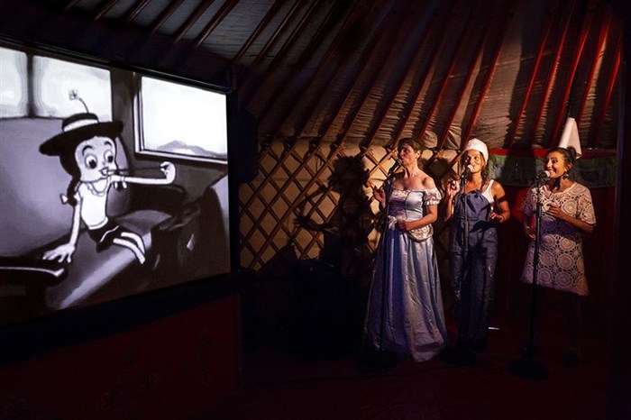 j'ai nommé le quartet buccal dans un ciné -spectacle une création 2O2O qui ravit les petits et fait sourire les grands.J'ai été contente de revoir de vieux Betty Boop et autres courts métrages en noir et blanc animés par les voix des quatre chanteuses(bruitages, doublages et dialogues)Petits messages subliminaux un tantinet féministes pour les grands et revisitation visuelle de cendrillon pour les plus jeunes.Un spectacle jeune public à l'adresse du jeune public qu'il faut encourager et qui pourra dans le temps s'enrichir de plus de double sens à l'adresse des grands.Il faut donc donner du temps au temps mais j'ai vu des enfants très heureux participer de bon coeur tout en donnant eux aussi de la voix donc Cool pour tous