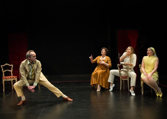 Une mise en scène Chorégraphiée : dans un espace rouge et noir , un pas de deux de Chrysale et Philaminte, des jupes et robes qui virevoltent , les danses de Henriette, le combat singulier de Trissotin et Clitandre, Colorée : le bleu Chrysale, l'ocre Philaminte, le mauve Clitandre, le blanc Trissotin, le jaune Bélise, et le rouge de l'incendiaire et blonde Henriette par qui souffle un vent de liberté. Musicale et chorale : extraits de chansons, la guitare d'Armande , Philaminte Armande et Bélise en état de délectation face aux vers de Trissotin qu'elles répètent à l'envie comme une musique baroque . C'est très drôle, par le jeu des acteurs, le comique discret de Chrysale, les affêteries et excès de langage, l'illusion de Bélise, c'est grave par l'aspiration sincère de Philaminte au savoir et à l'égalité homme femme, c'est libérateur par la raillerie des conventions et la volonté de bonheur d'Henriette. Un moment de poésie , Armande et sa guitare, seule, près de la lunette astonomique . A NE PAS MANQUER