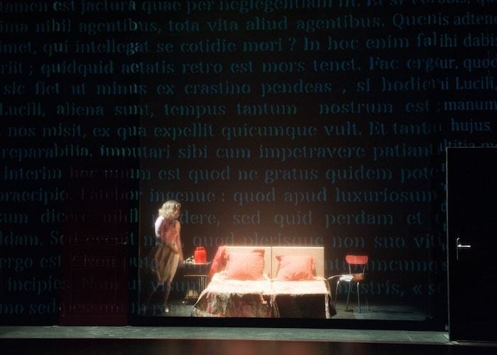 Une mise en scène Chorégraphiée : dans un espace rouge et noir , un pas de deux de Chrysale et Philaminte, des jupes et robes qui virevoltent , les danses de Henriette, le combat singulier de Trissotin et Clitandre, Colorée : le bleu Chrysale, l'ocre Philaminte, le mauve Clitandre, le blanc Trissotin, le jaune Bélise, et le rouge de l'incendiaire et blonde Henriette par qui souffle un vent de liberté. Musicale et chorale : extraits de chansons, la guitare d'Armande , Philaminte Armande et Bélise en état de délectation face aux vers de Trissotin qu'elles répètent à l'envie comme une musique baroque . C'est très drôle, par le jeu des acteurs, le comique discret de Chrysale, les affêteries et excès de langage, l'illusion de Bélise, c'est grave par l'aspiration sincère de Philaminte au savoir et à l'égalité homme femme, c'est libérateur par la raillerie des conventions et la volonté de bonheur d'Henriette. Un moment de poésie , Armande et sa guitare, seule, près de la lunette astonomique . A NE PAS MANQUER