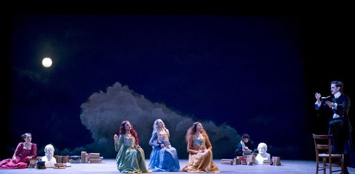 La comédie ressemble à un conte, mais nous sommes au théâtre et la farce est au service de la vérité. Le langage de l'amour aura finalement raison de l'amour du langage. Comme toujours dans les comédies de Molière, la satire est puissante, et le rire est le moteur de la fable. Mais l'émotion affleure avec ces femmes savantes qui se donnent toutes entières à leur passion, sans crainte du ridicule, jusqu' à l'effondrement final.