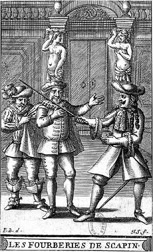 Afin de le soustraire à ce danger, Scapin cache sa victime dans un sac, et lui donne de violents coups, tout en feignant de le protéger des spadassins qui sont à sa recherche.