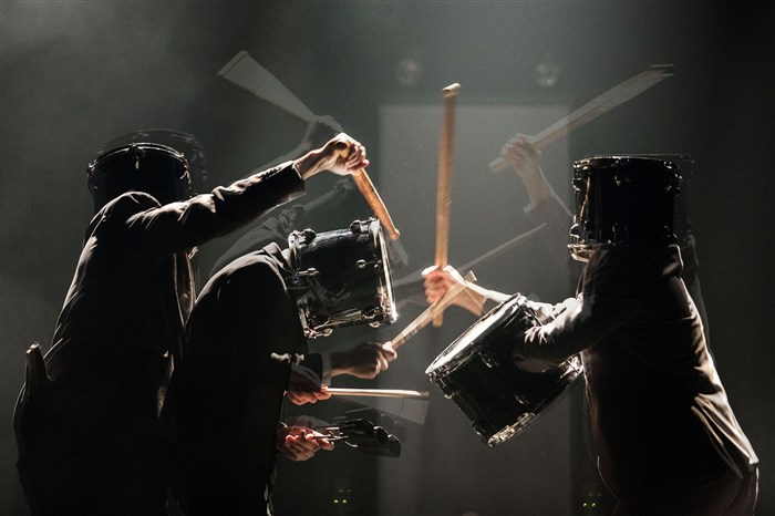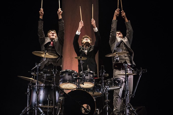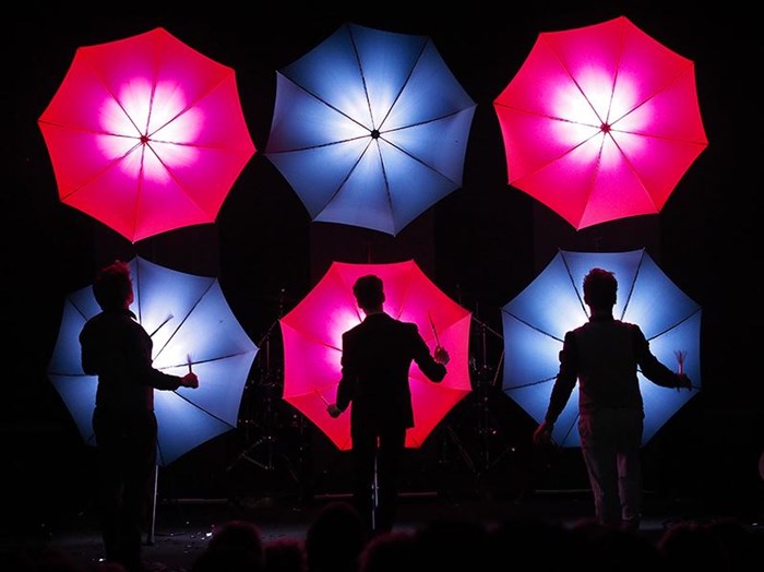Tout est source de percussions, mais les prédispositions artistiques du trio ne s'arrêtent pas là : cornemuse, flûte et guitare entrent dans la danse et les objets voltigent aussi bien les quilles que les parapluies. L'imagination est sans borne au service d'un spectacle époustouflant !