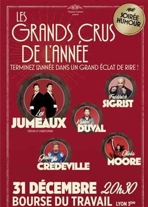 Le 31 décembre à la Bourse du Travail à Lyon, retrouvez les Jumeaux, Frédérick Sigrist, Gérémy Credeville, Olivia Moore et Karim Duval ! Les Grands Crus de l'Année de la scène humoristique française pour vous servir et terminer l'année dans un grand éclat de rire !