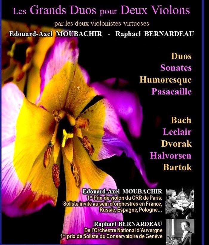 Duos, Sonates, Humoresque, Pasacaille de Bach, Leclair, Dvorak, Halvorsen, Bartok, par les deux violonistes virtuoses Edouard-Axel Moubachir et Raphael Bernardeau
