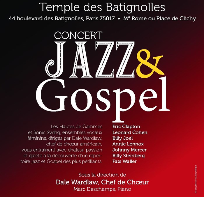 Les Hautes de Gammes et Sonic Swing, ensembles vocaux féminins du C.I.F.P., dirigés par Dale Wardlaw, chef de choeur américain,vous entraînent avec chaleur, passion et gaieté à la découverte d'un répertoire Jazz et Gospel des plus pétillants (Éric Clapton, Léonard Cohen, Billy Joel, Annie Lennox, Johnny Mercer, Billy Steinberg, Fats Waller).