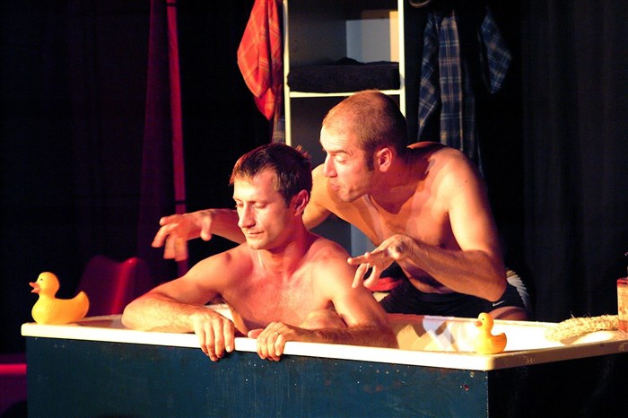 La pièce se fait parodie de la télé-réalité, les divagations de nos héros étant scrutées en permanence par le regard perçant de 3 caméras indiscrètes, un confessionnal recueille les sentiments pêle-mêle de ces deux hommes contraints par la production à vivre dans la promiscuité.