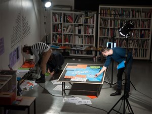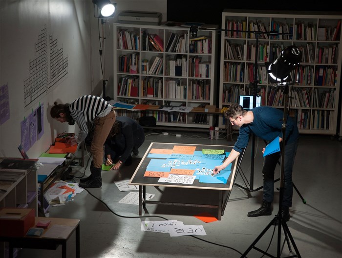 L'exposition Degré 48 au Cneai présente également les dispositifs éditoriaux de documentation et d'impression imaginés par l'atelier g.u.i, remettant ainsi en jeu les techniques et les modes d'assemblages des captations vidéos et photos des soirées, les fichiers sources des artistes, les manifestes écrits, ainsi que la documentation produite par le public.