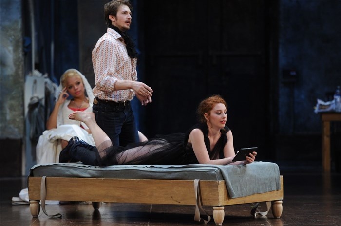 En jeans et baskets avec vestes, coiffures et corsets rappelant le 18e siècle, portables à la main et tablettes dans le sac, les acteurs rejouent les multiples intrigues du roman... et s'échangent des mails et des SMS !