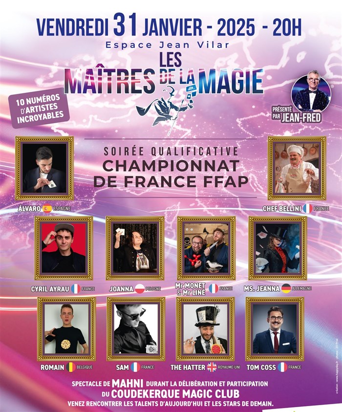 Le vendredi 31 janvier 2025, Coudekerque-Branche accueillera une soirée exceptionnelle avec les Maîtres de la magie, qui servira de soirée qualificative pour le championnat de France de Magie organisé par la FFAP (Fédération Française des Artistes Prestidigitateurs). Dix candidats talentueux auront l'opportunité de démontrer leur habileté et leur créativité dans des numéros de magie variés, allant de la magie de scène à la magie de proximité.