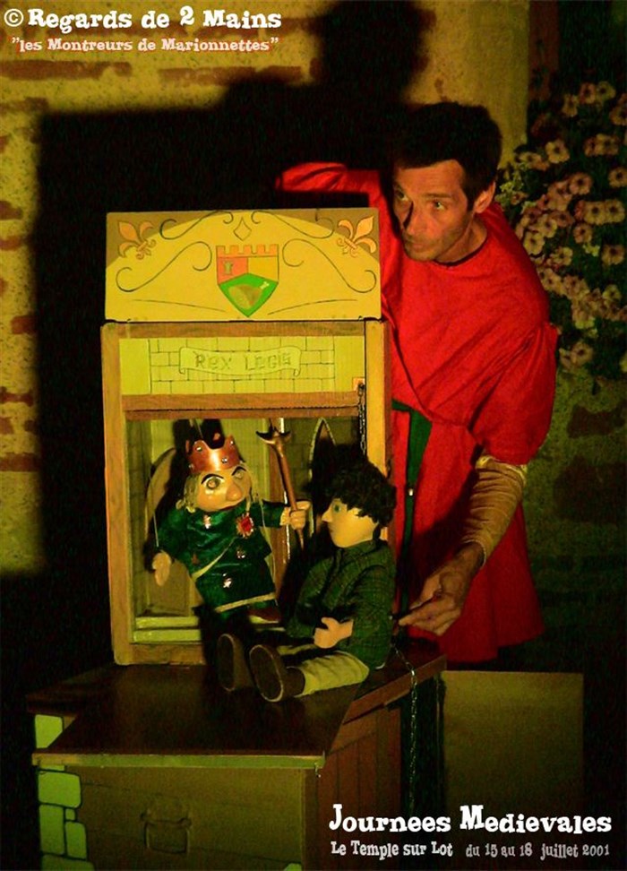 Tel un théâtre de tréteaux de l'époque, inspiré des tableaux " Les riches heurs du Duc de Berry ", le spectacle " Les montreurs de marionnettes " s'inscrit dans l'esprit du moyen âge.