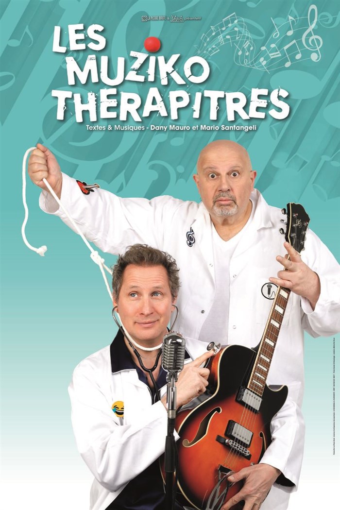 Les Muziko-Thérapitres sont deux médecins loufoques... (Dany Mauro - humoriste chanteur & Mario Santangeli - musicien chanteur) mandatés par l'OMS (l'organisation mondiale du sourire), dont la mission est de soigner vos addictions, maladies, allergies, phobies, grâce une thérapie musicale et déconnante à base de chansons, d'imitations, de gags et de fous rires. Un spectacle participatif et interactif avec le public.