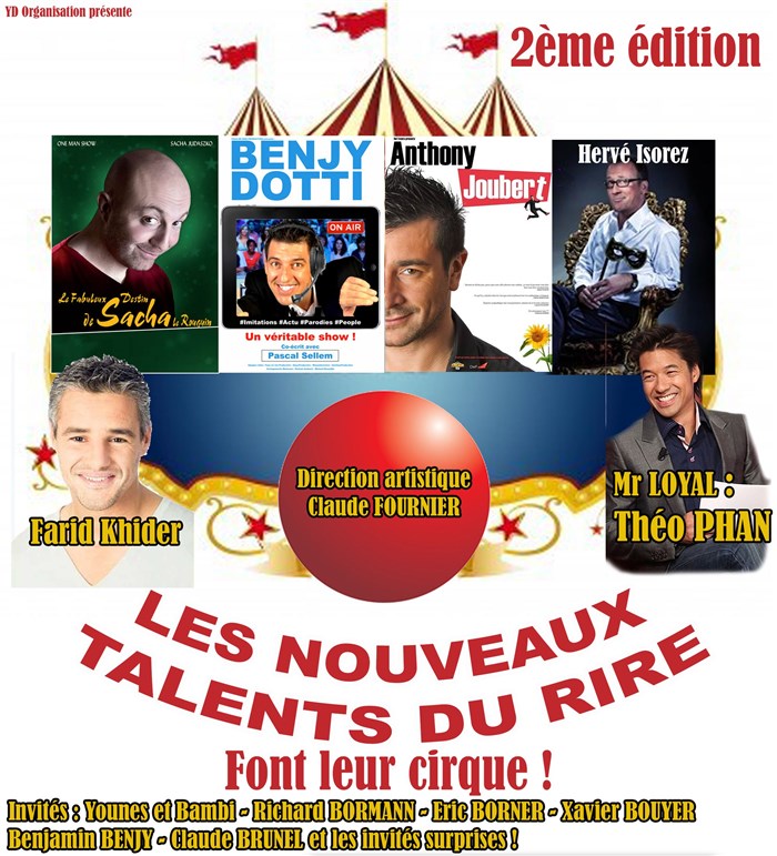 Pour cette 2ème édition sous ce chapiteau, retrouvez la relève du comique en France avec Anthony Joubert, Benjy Dotti, Hervé Isorez, Farid Khider, Younes & Bambi, Sacha Judaszko