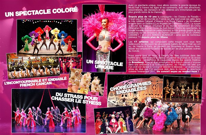 Opening Plumes – James Bond Medley – Sexy Chic Ballet - Mambo Chacha – " Queen " Medley Rock – Disco Medley - Fantôme de l'Opéra – Acrobatique Urbain Ballet - la Belle journée à Versailles – Sexy Caraïbe Pirates – Cotton Club 1930 – Madonna Medley – China Contemporain Ballet - L'incontournable et endiablé French Cancan – Le grand Final.