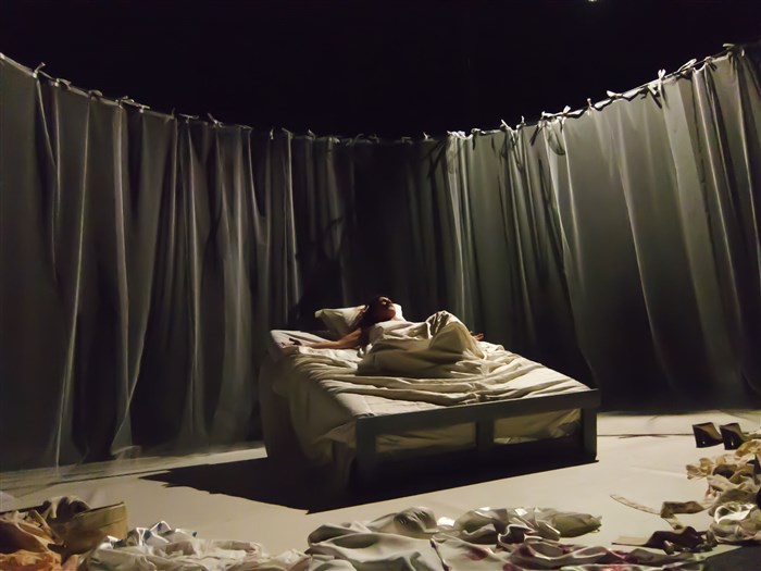 Il ne s'agit cependant pas d'un monologue. Derrière l'alcôve blanche, un musicien, marc Glomeau, est à l'oeuvre.