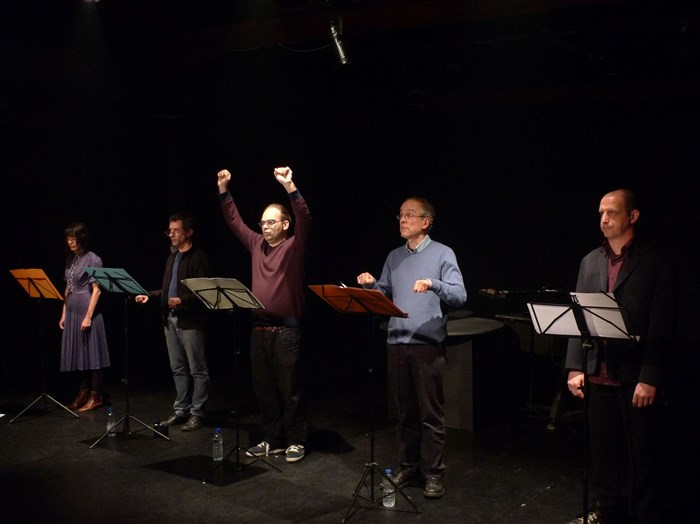 Cinq pupitres, cinq solistes pour des lectures polyphoniques de textes du Moyen-Âge à nos jours, qu'ils prennent comme de véritables partitions.