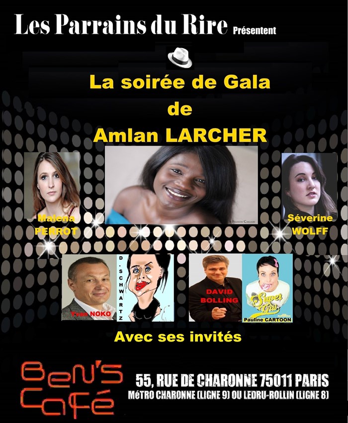 Les Parrains du Rire accueillent Amlan Larcher pour sa soirée de Gala avec pour invité : Danièle Schwartz, Malena Perrot, Séverine Wolff, Pauline Cartoon, David Bolling et Yvan Noko.