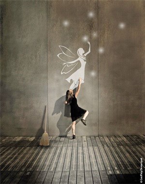 Une fée marraine cache un bout de sa queue de poisson sous son jupon.