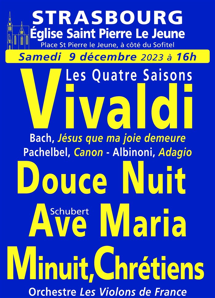 Certaines oeuvres ont leur secret ; Les Quatre Saisons en possèdent certainement un, elles qui sont parvenues à une telle célébrité dans la musique classique. Elles seront interprétées dans leur intégralité par Les Violons de France. En cette période de l'Avent, les célèbres Douce Nuit et Minuit Chrétiens vous plongent dans la magie de Noël. Egalement au programme : adagio d'Albinoni, Le canon de Pachelbel, et Jésus que ma joie demeure de Bach. L'Ave Maria de Schubert complètera ce programme d'environ 1h20.